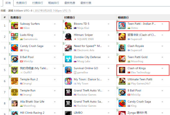 看上印度棋牌游戏市场的中国游戏公司,并非仅有游族一家,IGG、DroidHen、博雅互动等都在印度上线棋牌类游戏,且在印度畅销榜上的表现不错。