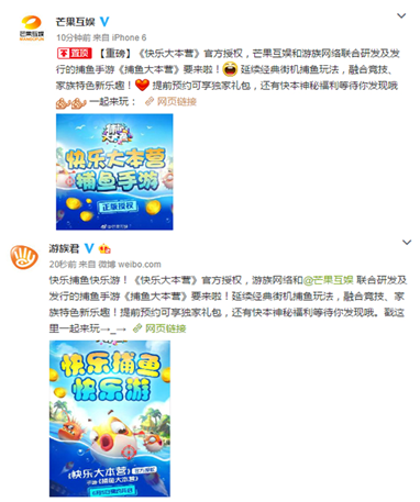 近日,芒果互娱和游族网络通过官方微博发布联合声明:由《快乐大本营》官方授权,游族网络与芒果互娱联合研发及发行的《捕鱼大本营》即将上线。